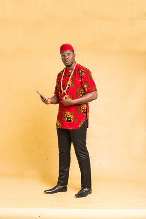Igbo Traditionally Dressed Business Man Standing with Phone in Hand Posing