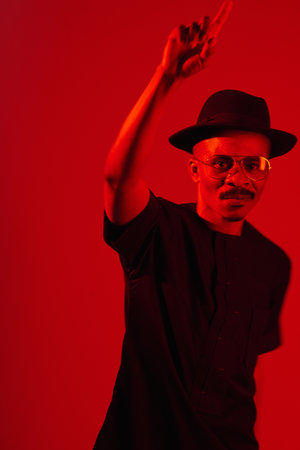 Portrait of fashionable African American man in black fedora doing hip hop hand gesture and looking at camera in red neon lighting