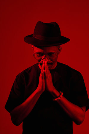 Portrait of stylish African American man in black clothes, fedora hat and sunglasses holding hands in prayer in red neon lighting
