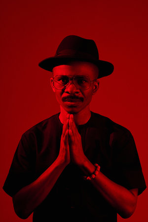Portrait of Black man with moustache in stylish black outfit holding hands in prayer and looking at camera in red neon light