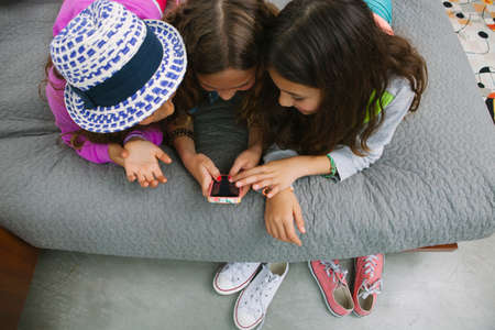 Minimal portrait of two teenage girls using smartphone and smiling while relaxing against white background