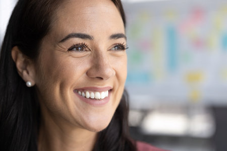 Close up portrait of smiling professional woman looking away thoughtfully and positively posing in workplace, copy space. Clear business vision, forward-thinking, and hopeful outlook towards future