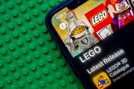 Calgary, Alberta. Canada. Jan 29, 2021. A close up to the Lego application on a iPhone X screen with a green brick background