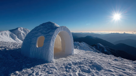 Snow igloo sits in the mountains as sunlight shines above, highlighting the snowy landscape and distant peaks.