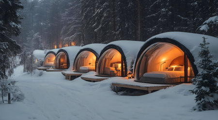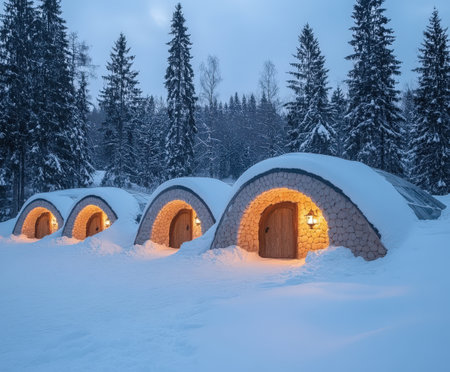 Cozy snow-covered igloo cabins illuminated at dusk in a winter forest landscape.