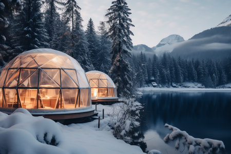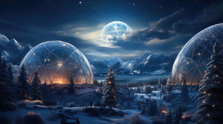 Winter holiday in a luxury modern glass igloo hotel with beautiful view on mountains, forest and night sky