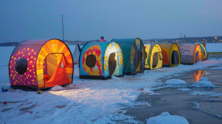 A row of brightly decorated tents set up near the edge of a frozen lake providing warm refuge for those who brave the ice plunge