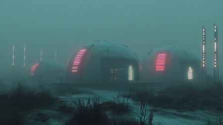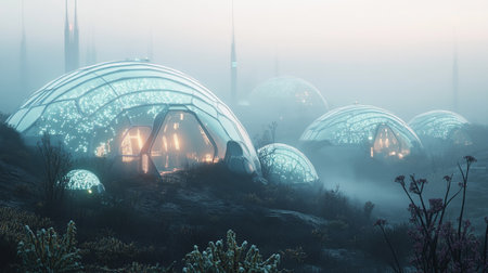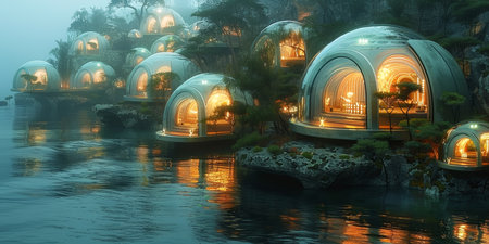 Illuminated dome homes on a foggy waterfront, serene living concept. World Ocean Day. With Generative AI technology.
