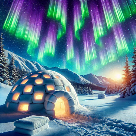 An AI generated illustration of an igloo surrounded by nature with a vibrant display of aurora lights