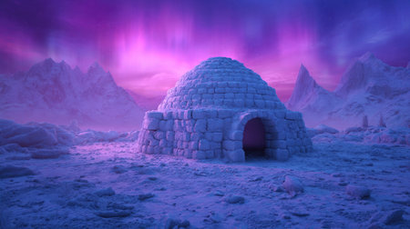 An igloo stands in a snow-covered environment, under a sky displaying the aurora borealis. The image showcases cool tones and textures, with the igloo's structure and the surrounding landscape detailed. It can be used for artistic, educational, and design projects.