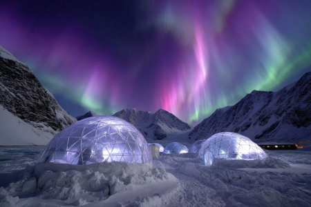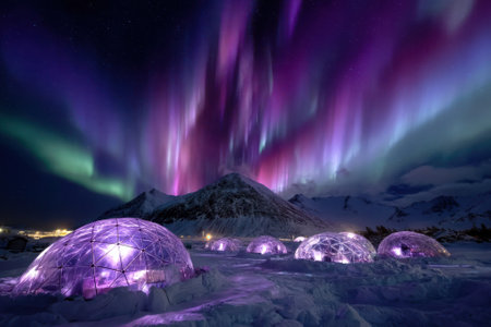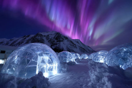 Colorful northern lights illuminate the night sky above igloos in a winter wonderland setting.