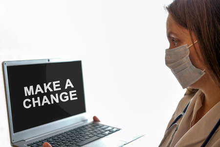 Doctor woman in a mask with stethoscope looks at the monitor screen where the text Make a change is written