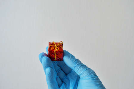 Female hand in blue rubber gloves holding a red gift on a white background.