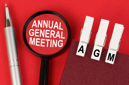 business concept. On the red surface lies a pen, a notebook with clothespins - AGM, and a magnifying glass with the inscription - Annual general meeting