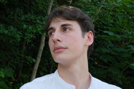 Portrait of a young man looking at the horizon, with green leaves in the background.