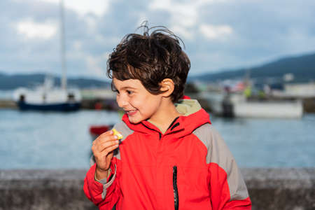 Portrait of a child against the sea. The boy holds the candy in his hands.