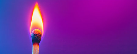 Burning matchstick with vibrant flame and purple gradient background. Contrast and energy concept