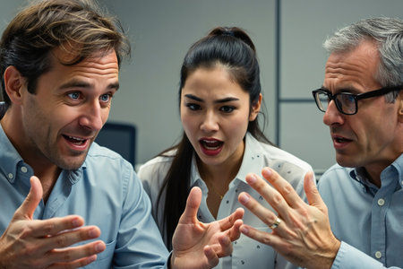 Three professionals, two men and one woman, in a heated discussion, wearing business attire, in a modern office.