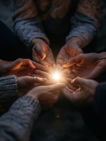 Group of individuals in a supportive circle, joining hands around a bright light in the center, creating a calming atmosphere during a nighttime gathering