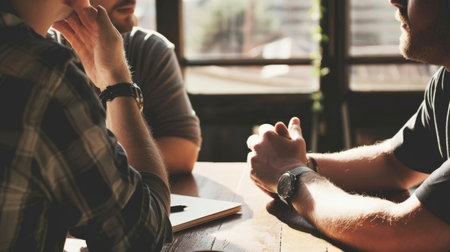 Group of people discuss ideas in a meeting room during daylight hours