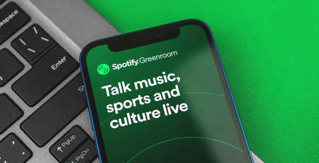 Kharkov, Ukraine - June 17, 2021: Spotify Greenroom app logo, banner photo with green desktop background