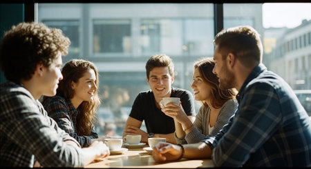A group of five young adults sitting at a table in a bright cafe, engaged in conversation and enjoying coffee, with sunlight streaming through the windows