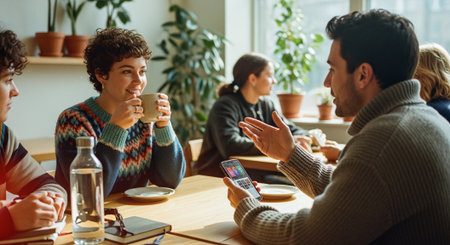 A group of friends chatting in a cozy cafe, one person holding a smartphone, warm atmosphere with plants and coffee cups