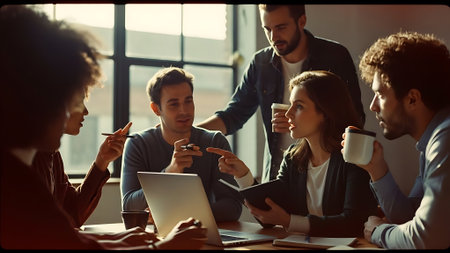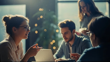A team leader guides a group of people sitting around a table, each focused on their laptops, A determined leader leading a team meeting with enthusiasm and authority