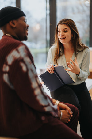 Engaged business colleagues in conversation indoors with notebook and smiles.