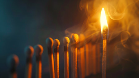 A row of matches with a single match lit up in the middle. Concept of focus and concentration on the single match, as if it is the most important thing in the scene
