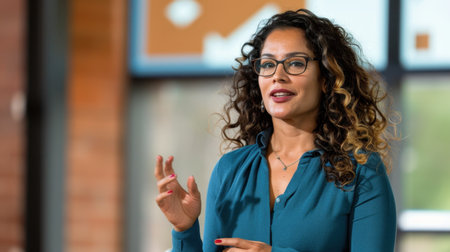 A confident businesswoman delivers a captivating presentation in a modern office, engaging her audience with her dynamic expression and eloquence.