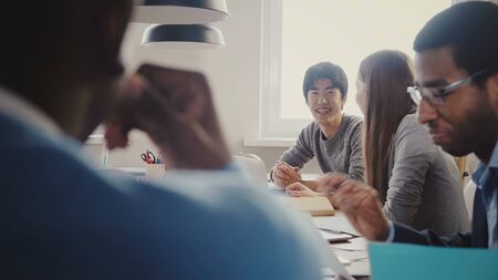 Successful team. Group of young multi-ethnic business people working and communicating together in creative office. Selective focus