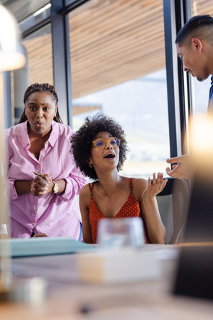 In office, colleagues discussing project ideas, expressing excitement and collaboration. Teamwork, brainstorming, partnership, innovation, creativity, business