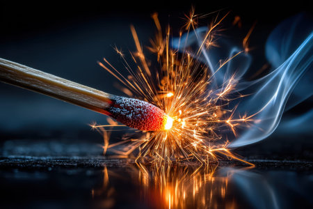 A close-up of a match being struck, under dramatic, focused light, with a sudden spark