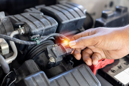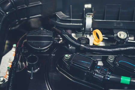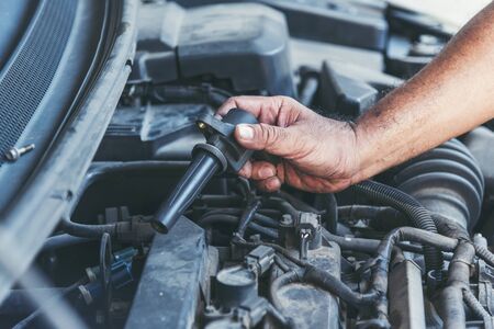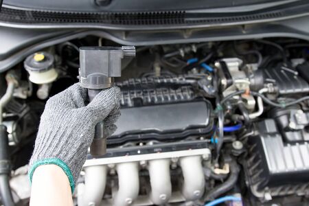 Hand a man check and change Ignition coil of Gasoline engine in engine room service concept and maintenance long time with car