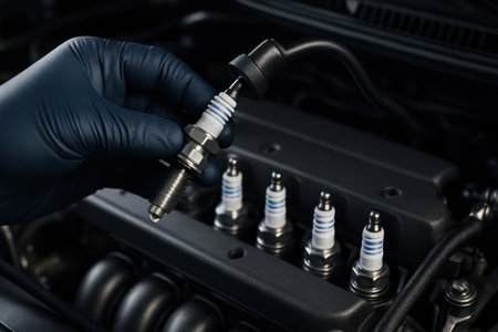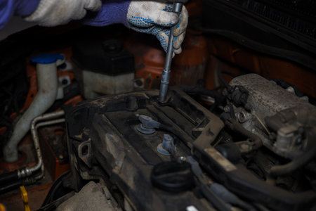 Auto mechanic wearing gloves and using a wrench for replacing spark plugs in a car engine during a maintenance service in a busy garage, ensuring optimal performance and reliability.