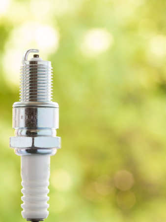 Auto service. New car spark plug as spare part of auto transportation on blurry green background.