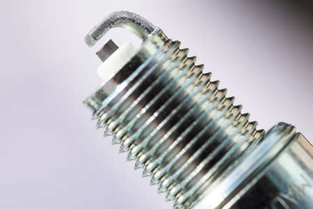 Auto service. New car spark plug as spare part of auto transportation on gray background.