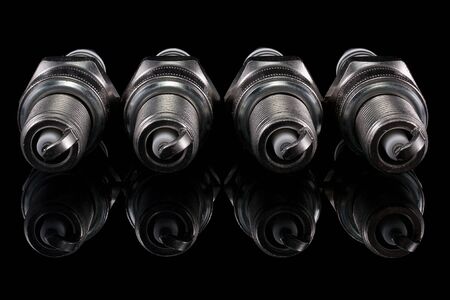 Creative abstract car repair service and automotive transportation industry business concept: macro view of metal spark plugs isolated on white background with reflection and selective focus effect