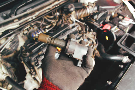 Ignition coil for spark plug of the car ignition system in the mechanic hand with a car blurred background in the repair garage