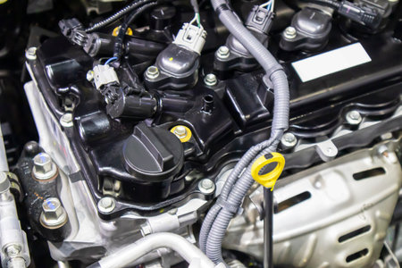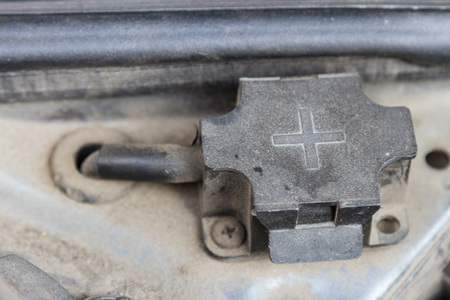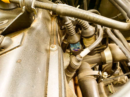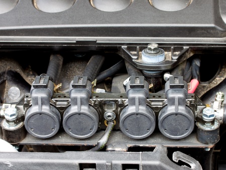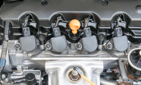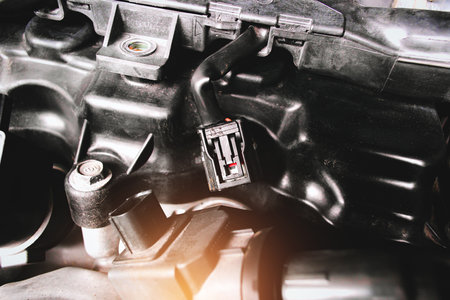 Close up of electronic plug connector of car ignition coil in the engine compartment
