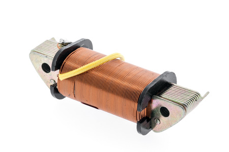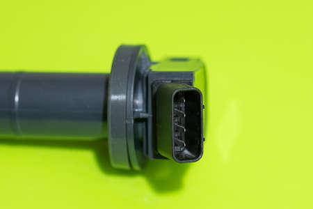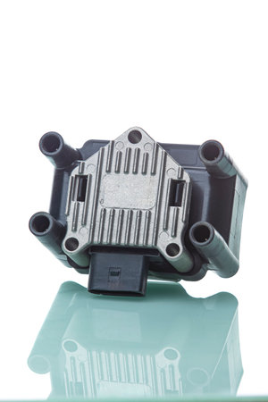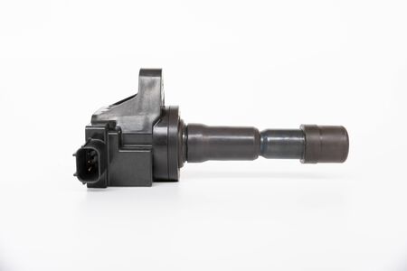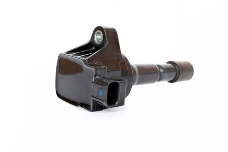 New car ignition coil on an isolated white background. Component of the ignition system. Spare parts.