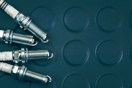 A new spark plugs for a car lie next to the car, engine operation concept, blurred background of a modern auto repair shop