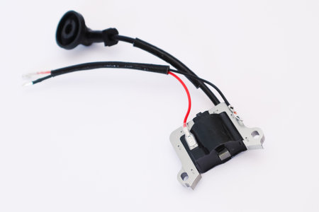 Close-up of a new ignition coil and attached spark plug cap for a small two-stroke engine (eg, chainsaw or trimmer) isolated on a clean white background. Essential replacement part.