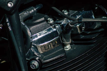 Limassol Cyprus June 10, 2020 Closeup of the mechanical part of a Harley Davidson motorbike parked in the streets of Limassol in Cyprus Island
