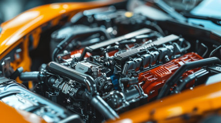 A closeup of the detailed engine bay of a rare sports car model revealing the artful assembly of its internal components and advanced engineering