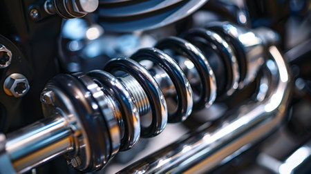 A detailed shot of a shock absorber on a motorcycle revealing the intricate inner workings that dampen vibrations