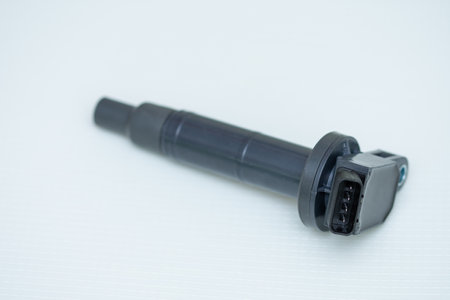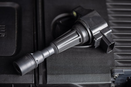 Black ignition coil for engine, isolated on white background. Spare parts for vehicle repair in garage.