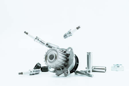 automotive parts. Set of new metal car part. Auto motor mechanic spare or automotive piece isolated on white background. Automobile engine service