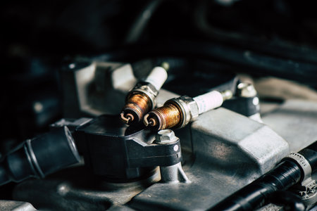 New and old candles on car engine background. Repair mechanic concept or diagnostic